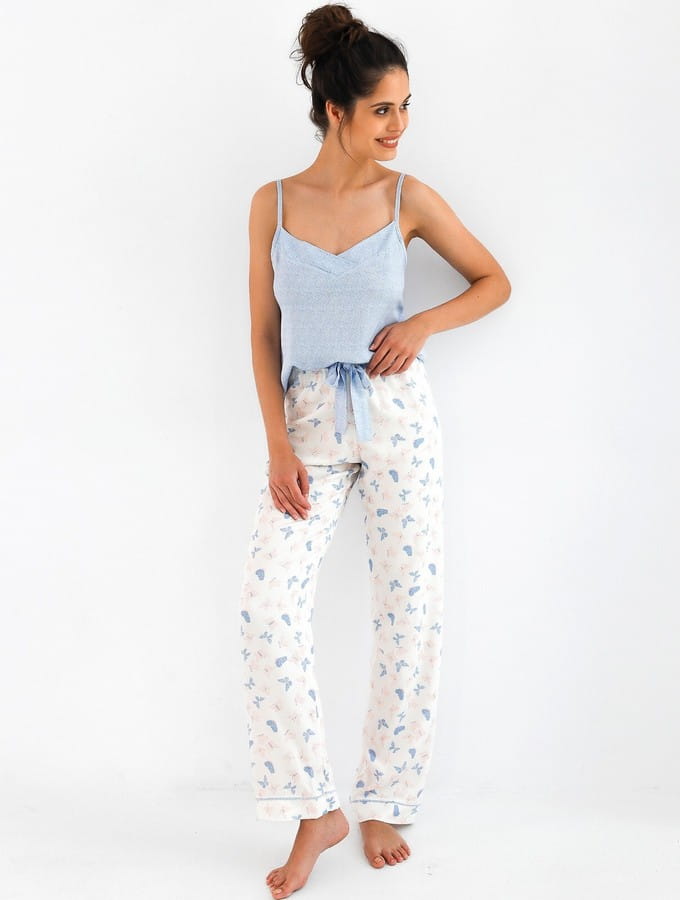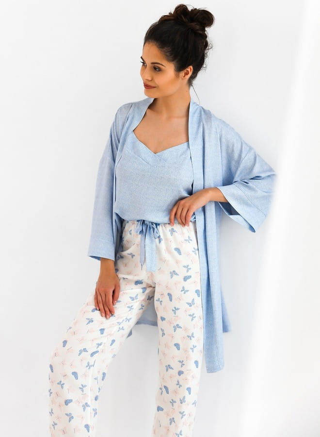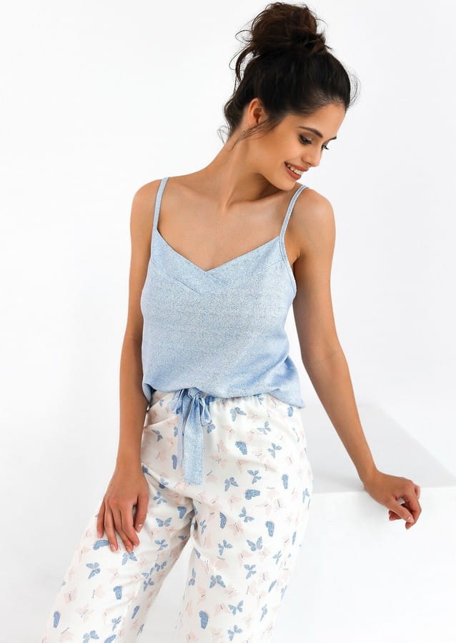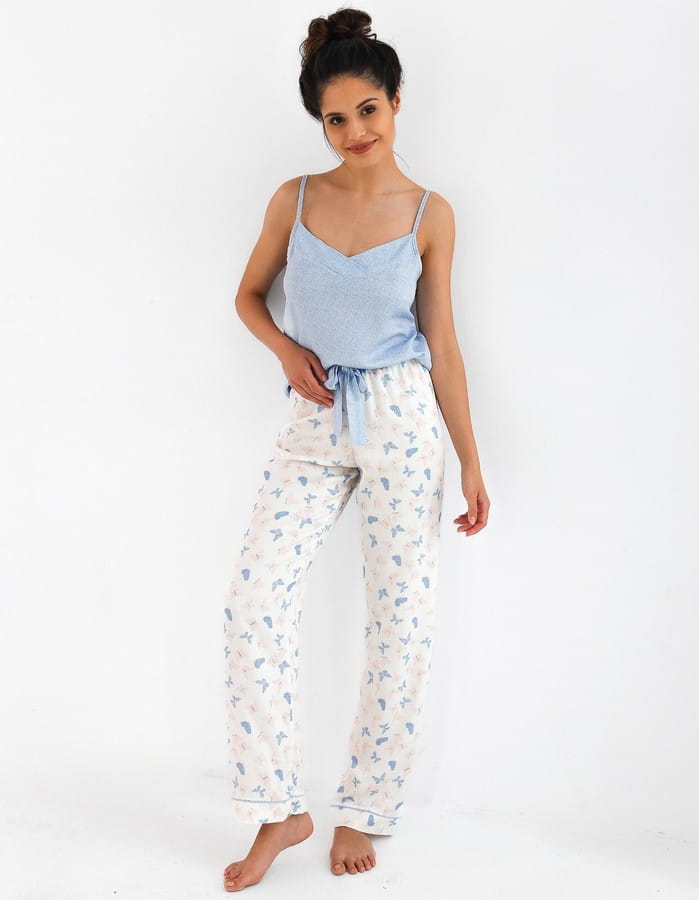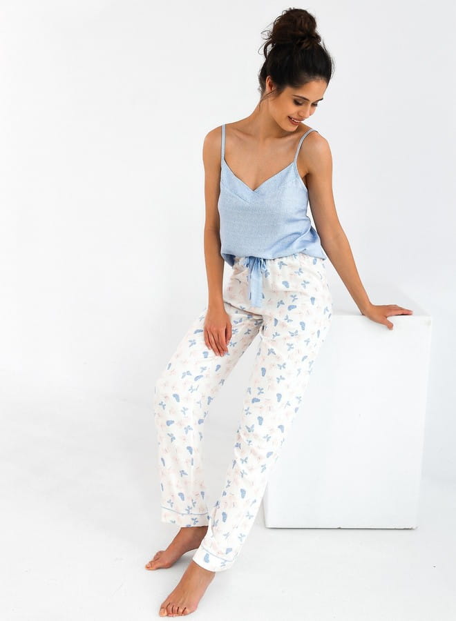 Spodní díl představují dlouhé, rovné kalhoty zdobené romantickým motivem motýlků. Elastický pas s ozdobnou saténovou mašličkou umožňuje perfektní přizpůsobení a dodává celkovému vzhledu elegantní nádech.