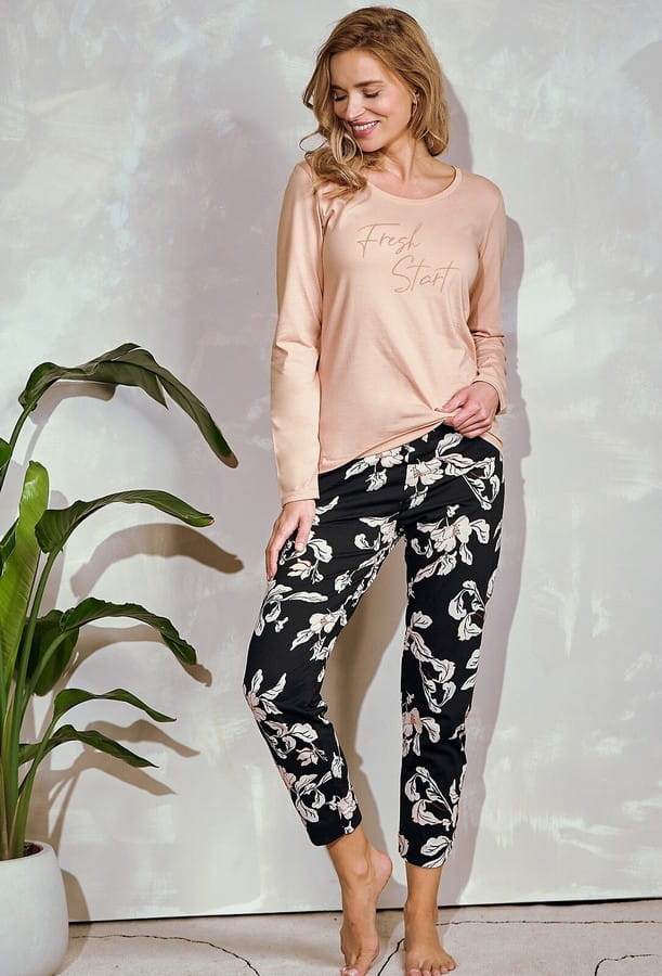 Vrchní část tvoří halenka s dlouhým rukávem v pudrově béžové barvě, která působí jemně a elegantně. Na přední straně se nachází decentní potisk, dodávající pyžamu ženský půvab. Půlkulatý výstřih krásně kopíruje linii krku a zajišťuje pohodlí při nošení.